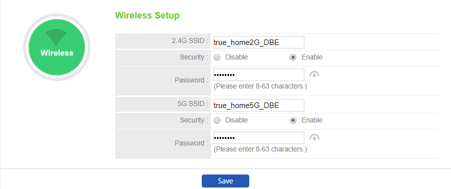 Just enter the new password of your WiFi key for both 2.4G and 5G connection. Then click button “Save” to save your new configuration. You can also change the SSID name to specify your own WiFi network.